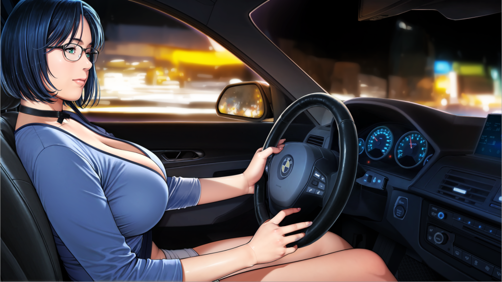 タイトな衣装に包まれたヒロインの胸のラインと、知的さを引き立てるメガネのギャップです。大豪邸での優雅な姿から一転、車内という密室で見せるこの「無防備かつ攻撃的な肢体」……。